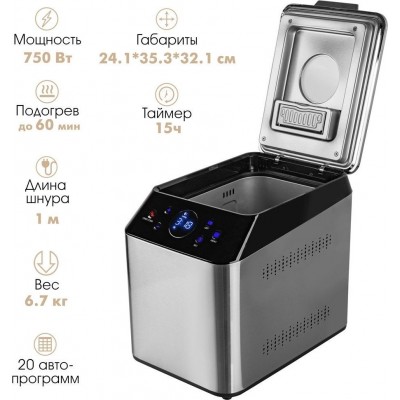 чаша с антипригарным покрытием, мерный стакан, мерная ложка, лопасть для замешивания, крюк для извлечения лопасти, руководство по эксплуатации, гарантийный талон
