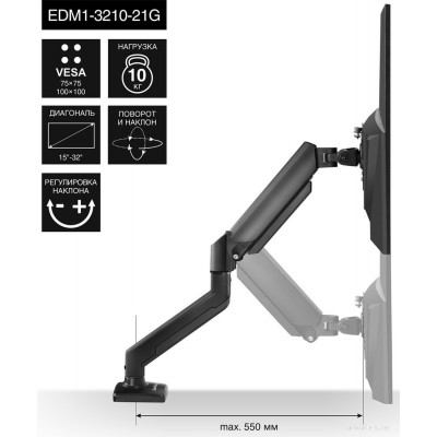 кронштейн для монитора, 15-32", 1 монитор, к столешнице, с регулировкой поворота, с регулировкой высоты, с кабель-каналом, струбцинное крепление, наклон -45-90°, поворот -90-90°, регулировка высоты 125-425 мм, цвет черный