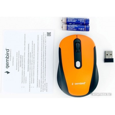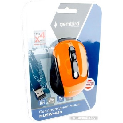 ноутбучная мышь, беспроводная радио, сенсор оптический 1600 dpi, 4 кнопки, колесо с нажатием, цвет оранжевый